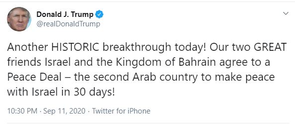वाशिंगटन। अमेरिकी राष्ट्रपति डोनाल्ड ट्रंप ने कहना है कि इजरायल और बेहरीन के बीच ऐतिहासिक शांति समझौता होने जा रहा है। डोनाल्ड ट्रंप ने ट्वीट कर बताया कि इजरायल और बहरीन ने कूटनीतिक संबंधों को पूरी तरह से बहाल करने के लिए एक ऐतिहासिक शांति समझौते को मंजूरी प्रदान की है। उन्होंने ट्वीट किया- आज एक और ऐतिहासिक सफलता। हमारे दो महान दोस्त इजरायल और बहरीन साम्राज्य एक शांति समझौते के लिए सहमत हो गए हैं। 30 दिनों में इजरायल के साथ शांति समझौता करने वाला दूसरा अरब देश।