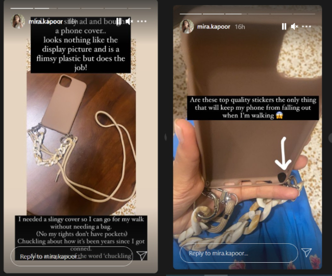मीरा ने अपने इंस्टाग्राम पर दो फोटोज़ शेयर की हैं जिनमें खस्ता हालत में एक फोन कवर नज़र आ रहा है। एक्ट्रेस ने फोटोज़ शेयर करने के साथ ही जानकारी दी है उन्होंने एक स्लिंग फोन कवर मंगवाया थे, लेकिन जब वो डिलीवर हुआ तो बिल्कुल वैसा नहीं था जैसा दिखाया गया था। इस बात पर मीरा ने नाराज़गी भी जाहिर की है। एक्ट्रेस का कहना है स्लिंग कवर उन्होंने इसलिए मंगवाया था ताकी वर्कआउट के दौरान उन्हें फोन रखने में आसानी हो, लेकिन जस तरह के कवर की डिलीवरी हुई है उससे वो बहुत अपेसट हो गई हैं।