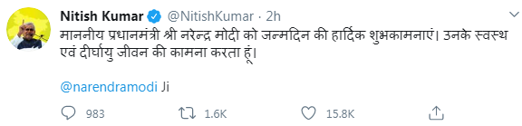 बिहार के मुख्यमंत्री नीतीश कुमार ने भी पीएम को इस मौके पर बधाई दी। उन्होंने ट्वीट में लिखा- माननीय प्रधानमंत्री श्री नरेन्द्र मोदी को जन्मदिन की हार्दिक शुभकामनाएं। उनके स्वस्थ एवं दीर्घायु जीवन की कामना करता हूं।